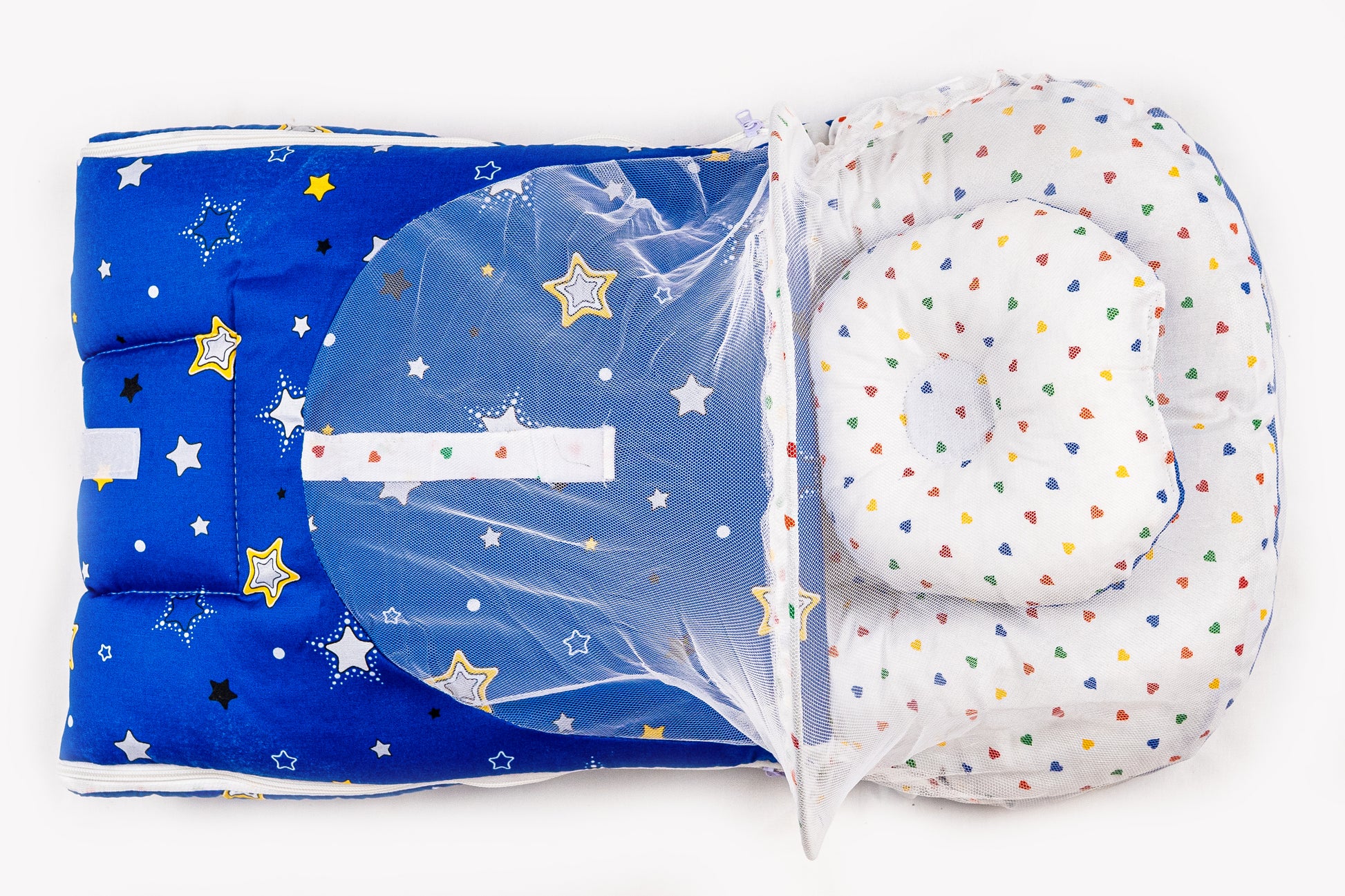 2pcs Baby Bedding Set with Mosquito Net – Navy Blue with colorful hearts & stars